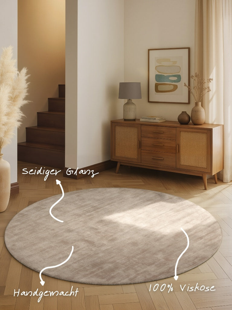 Teppich „Jane“ von vikosa – Stilvoll wohnen mit Glanz & Gefühl. Wohlig weich, brillant schön, natürlich gedacht: „Jane“ ist mehr als nur ein Teppich. Er ist ein Statement für stilvolles Wohnen, ein Gefühl unter den Füßen, ein Hauch von Luxus im Alltag. Gefertigt aus edler Viskose und einem stabilen Rücken aus recycelter Baumwolle, begeistert „Jane“ mit einer außergewöhnlich weichen, flauschigen Haptik. Jeder Schritt auf ihm fühlt sich an wie ein sanftes Versprechen von Komfort. So ist der Viskoseteppich ideal für gemütliche Wohnbereiche wie Wohnzimmer, Schlafzimmer oder ruhige Rückzugsorte. Der von Hand gewebte Teppich überzeugt mit einem feinen, seidig schimmernden Glanz, der jeden Raum aufwertet. Je nach Lichteinfall spielt der Teppich mit brillanten Farbtönen und changiert zwischen hell und dunkel – ein Zauberspiel der Farben, das Ihre Einrichtung zum Strahlen bringt. Sein einfarbiges Design lässt sich mühelos kombinieren, ob modern, klassisch oder kreativ, „Jane“ passt sich an und verleiht jeder Einrichtung das gewisse Etwas. Die Farbbrillanz der Viskosefaser sorgt dabei für elegante Tiefe und Ausdrucksstärke. Und das Beste: Viskose ist nicht nur schön, sondern auch funktional. Die Faser bindet kaum Staub oder Allergene, ideal für alle, die Wert auf ein sauberes Wohnklima legen. Wichtig zu wissen: Viskose reagiert empfindlich auf Feuchtigkeit und eignet sich daher nicht für Bad oder Küche. Jane ist für alle die das Besondere lieben: Handgemacht, Weich und mit einem Hauch Magie.