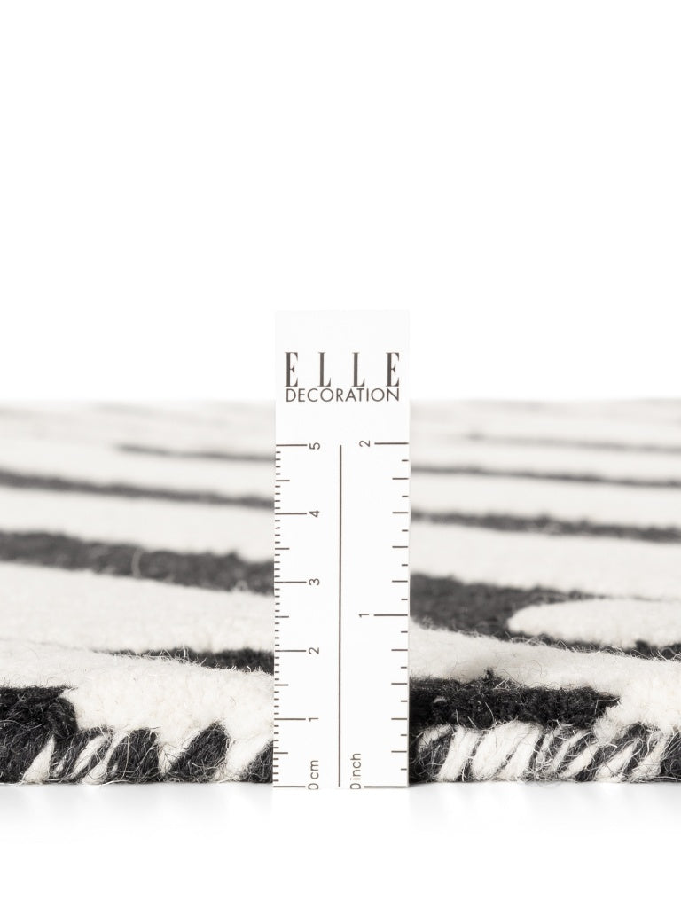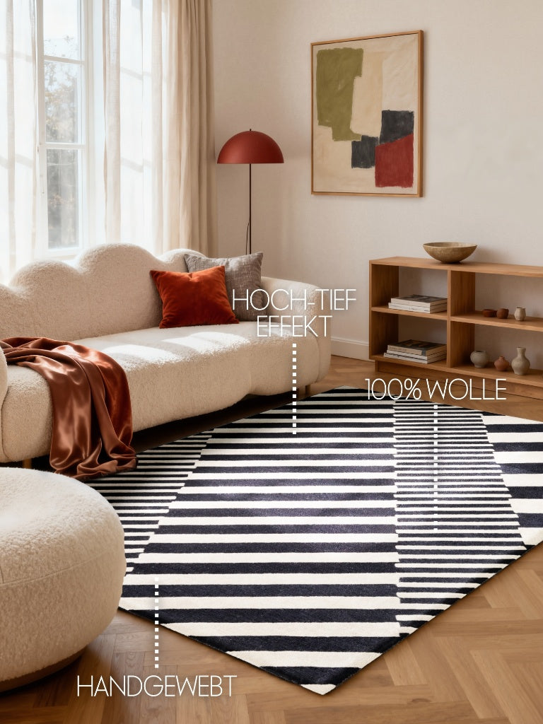 Die Elle Decoration Stryve Kollektion vereint modernes Design mit traditioneller Handwerkskunst. Dieser schwarz-weiß gestreifte Teppich aus 100% reiner Wolle wird handgewebt und besticht durch einen dynamischen Hoch-Tief-Effekt, der jedem Raum Struktur und Tiefe verleiht. Dank der hochwertigen Naturfaser ist der Teppich langlebig, pflegeleicht und bietet ein angenehmes, warmes Laufgefühl. Das geometrische Streifenmuster macht ihn besonders vielseitig: Ob modern, skandinavisch oder urban – er fügt sich harmonisch in unterschiedlichste Wohnstile ein. Jeder Teppich ist ein Unikat, das traditionelle Handarbeit sichtbar macht und Ihrem Zuhause eine individuelle Note verleiht. Für Fußbodenheizung geeignet. Typisch für Wollteppiche können anfänglich leichte Flusen auftreten und ein natürlicher Wollgeruch wahrnehmbar sein, beides verschwindet mit der Zeit. Regelmäßiges Saugen reduziert die Flusenbildung dauerhaft. Setzen Sie auf modernes Design in Kombination mit traditioneller Handarbeit und hochwertigen Naturmaterialien.