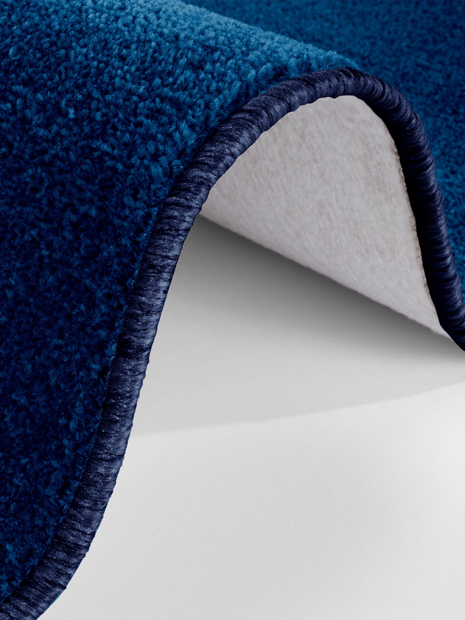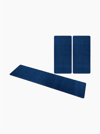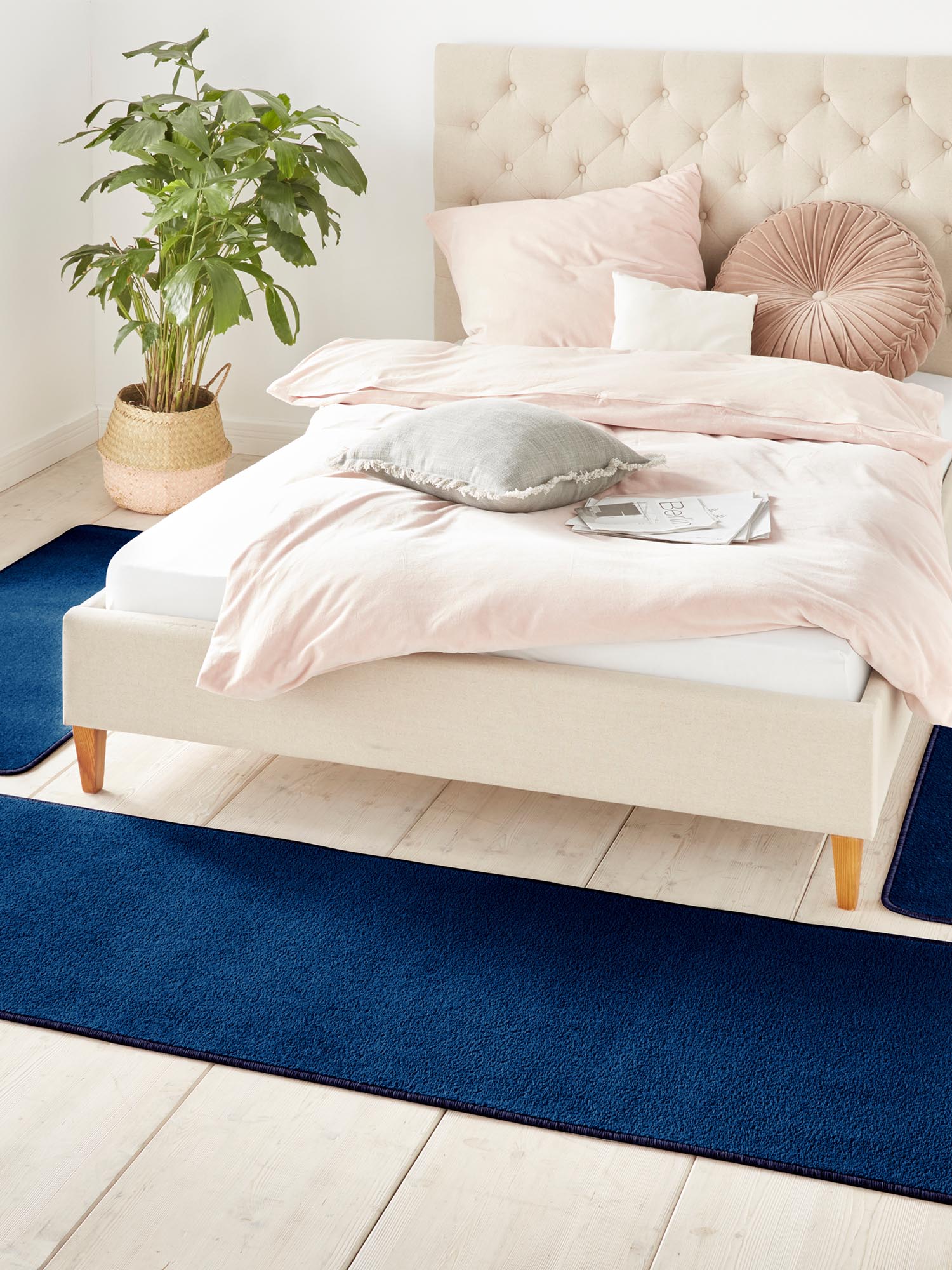 Effen donkerblauw vloerkleed voor naast het bed