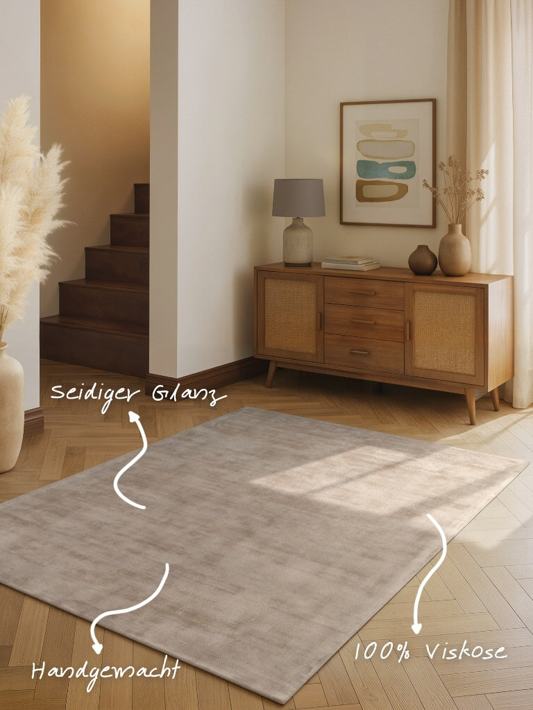Teppich „Jane“ von vikosa – Stilvoll wohnen mit Glanz & Gefühl. Wohlig weich, brillant schön, natürlich gedacht: „Jane“ ist mehr als nur ein Teppich. Er ist ein Statement für stilvolles Wohnen, ein Gefühl unter den Füßen, ein Hauch von Luxus im Alltag. Gefertigt aus edler Viskose und einem stabilen Rücken aus recycelter Baumwolle, begeistert „Jane“ mit einer außergewöhnlich weichen, flauschigen Haptik. Jeder Schritt auf ihm fühlt sich an wie ein sanftes Versprechen von Komfort. So ist der Viskoseteppich ideal für gemütliche Wohnbereiche wie Wohnzimmer, Schlafzimmer oder ruhige Rückzugsorte. Der von Hand gewebte Teppich überzeugt mit einem feinen, seidig schimmernden Glanz, der jeden Raum aufwertet. Je nach Lichteinfall spielt der Teppich mit brillanten Farbtönen und changiert zwischen hell und dunkel – ein Zauberspiel der Farben, das Ihre Einrichtung zum Strahlen bringt. Sein einfarbiges Design lässt sich mühelos kombinieren, ob modern, klassisch oder kreativ, „Jane“ passt sich an und verleiht jeder Einrichtung das gewisse Etwas. Die Farbbrillanz der Viskosefaser sorgt dabei für elegante Tiefe und Ausdrucksstärke. Und das Beste: Viskose ist nicht nur schön, sondern auch funktional. Die Faser bindet kaum Staub oder Allergene, ideal für alle, die Wert auf ein sauberes Wohnklima legen. Wichtig zu wissen: Viskose reagiert empfindlich auf Feuchtigkeit und eignet sich daher nicht für Bad oder Küche. Jane ist für alle die das Besondere lieben: Handgemacht, Weich und mit einem Hauch Magie.